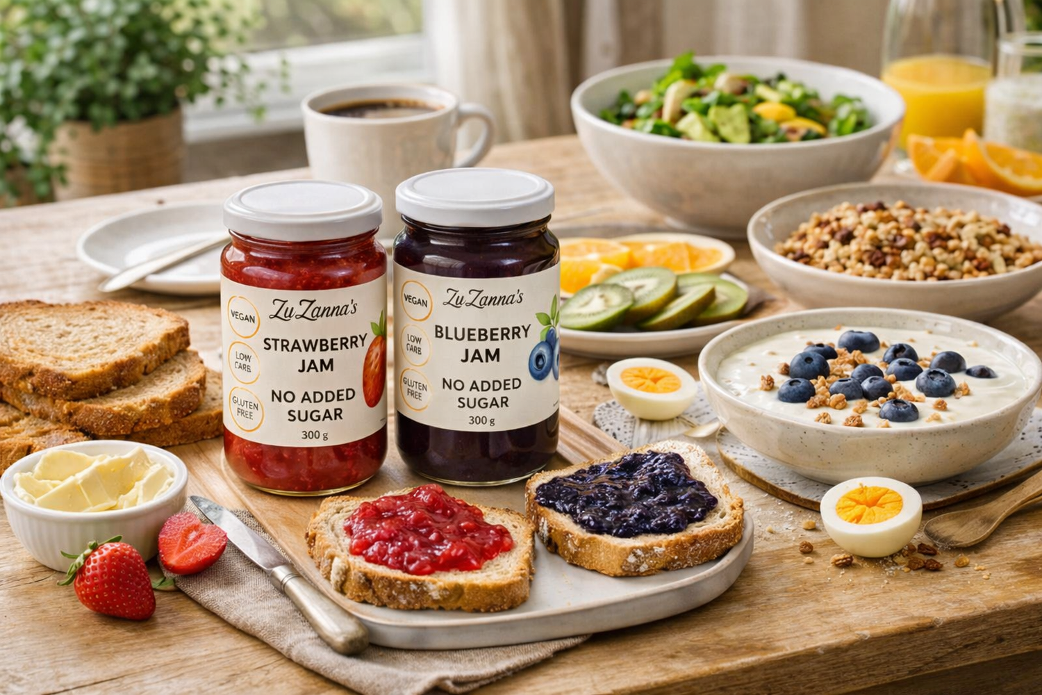 Our jams, sauces, and snacks are made to fit real meals, real households, and real routines — without turning food into “diet food”.